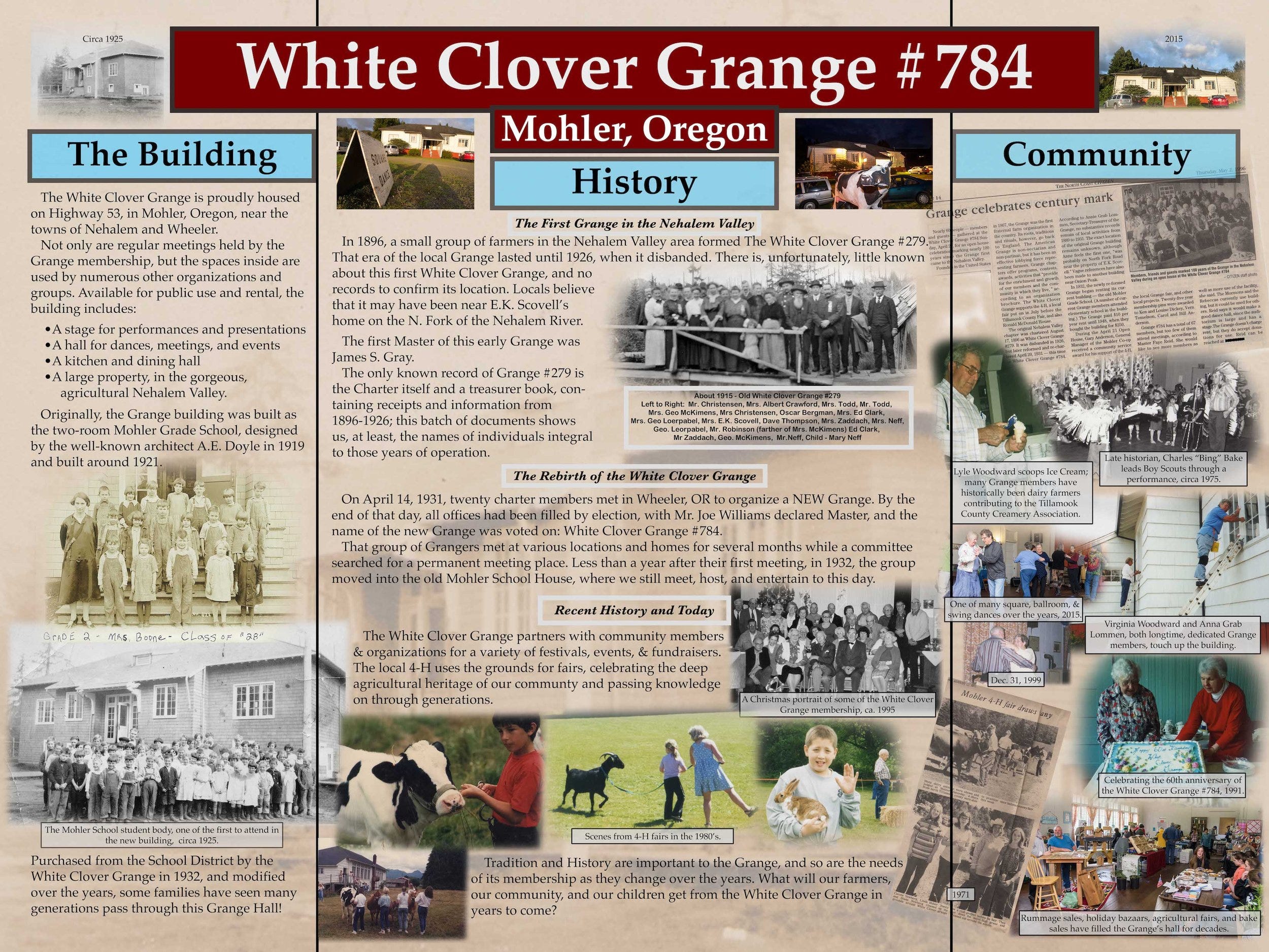 The White Clover Grange was built in 1921 as the Mohler School, designed by the prominent Portland architect A. E. Doyle. In 1929, the Mohler School consolidated with the Nehalem School District leaving the building empty, and in 1931, the building became the home of White Clover Grange #784. For the next 30 years, the Grange served as a key social hub for the Nehalem community, with families gathering weekly to play pinochle, hold dances, enjoy potlucks, and exchange news. With the advent of television, the drive to have a place to get together lessened, however the commitment to maintain the Grange as a site for special events has never wavered.